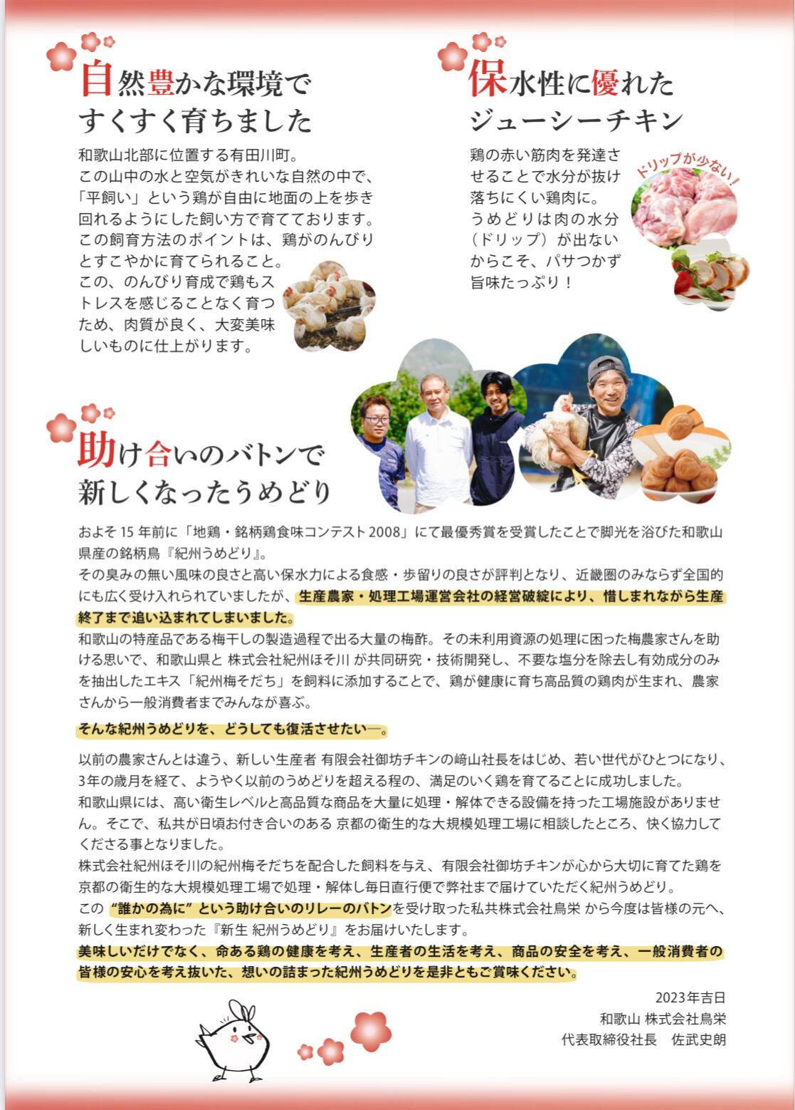 かつて全国でも高い評価をいただきながら惜しまれつつ生産終了した『和歌山県産 紀州うめどり』が、更に美味しく安全になって復活しました!